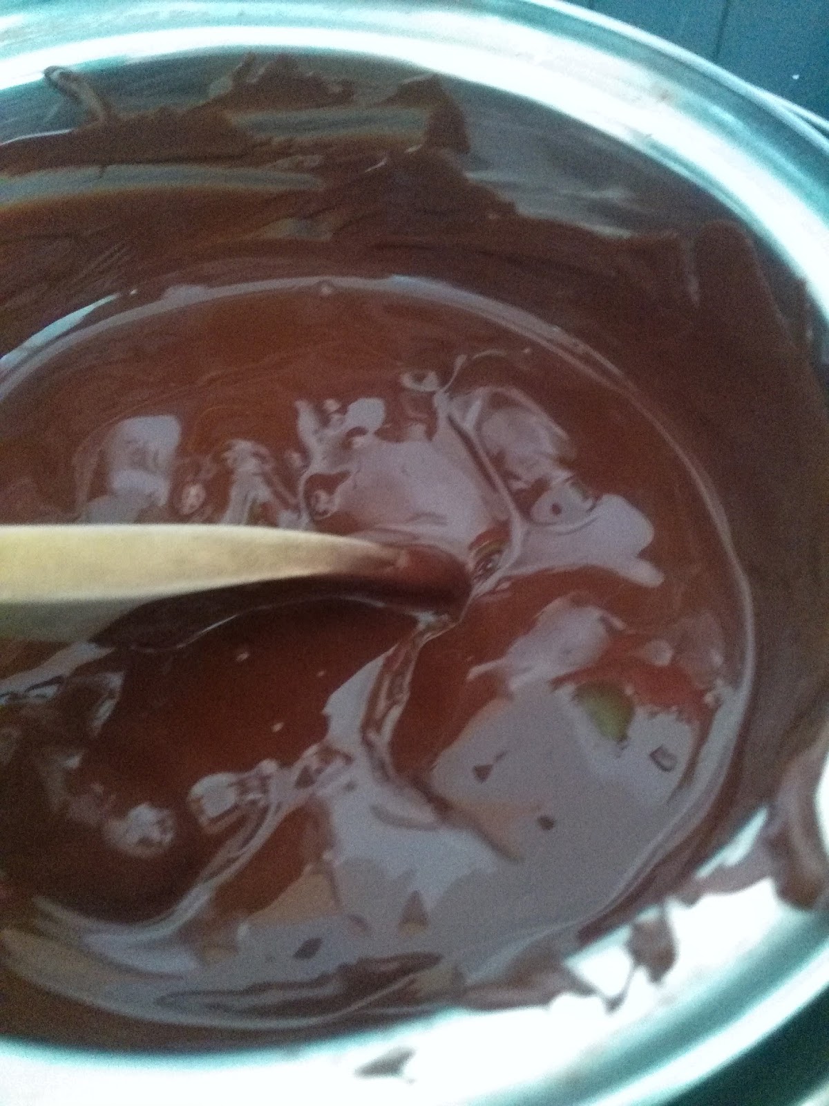 Připravíme si horkou lázeň. Do většího kastrůlku dáme vodu a na něj posadíme menší kastrůlek. Jakmile voda vře nalámeme čokoládu do menšího kastrůlku. A mícháme, a mícháme a mícháme… dokud se čokoláda úplně nerozpustí.